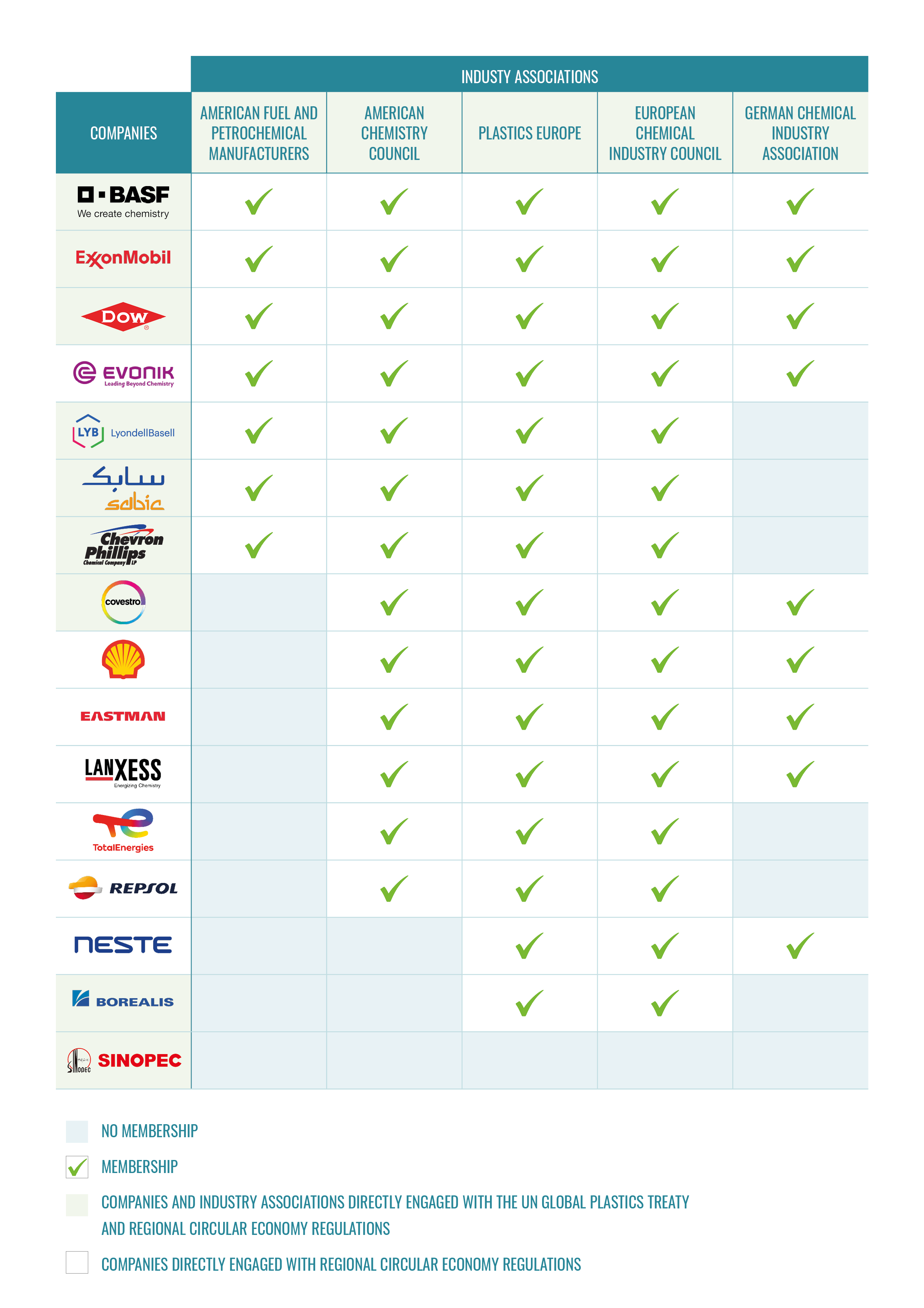 All companies but one are direct members of industry associations that actively and negatively engaged with the Treaty in 2022–24. Of the five industry associations identified as actively not supporting the Treaty, two (the American Chemistry Council (ACC) and the American Fuel and Petrochemical Manufacturers (AFPM)) are based in the US, two (PlasticsEurope and the European Chemical Industry Council (Cefic)) in Brussels, and one (the German Chemical Industry Association (VCI)) in Germany.